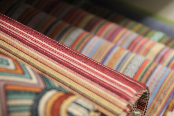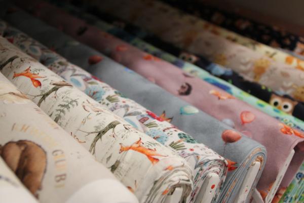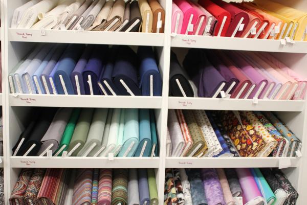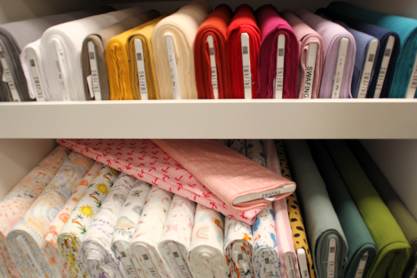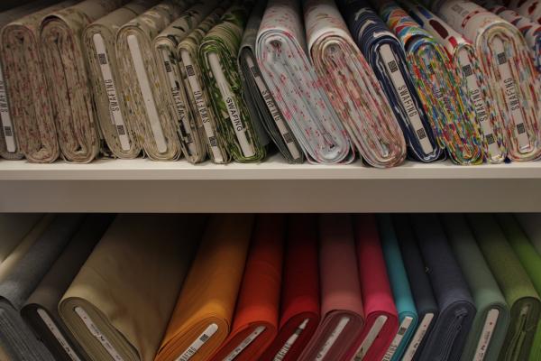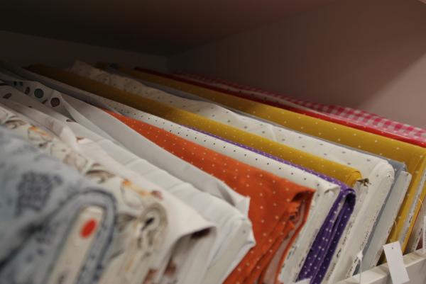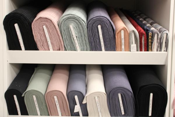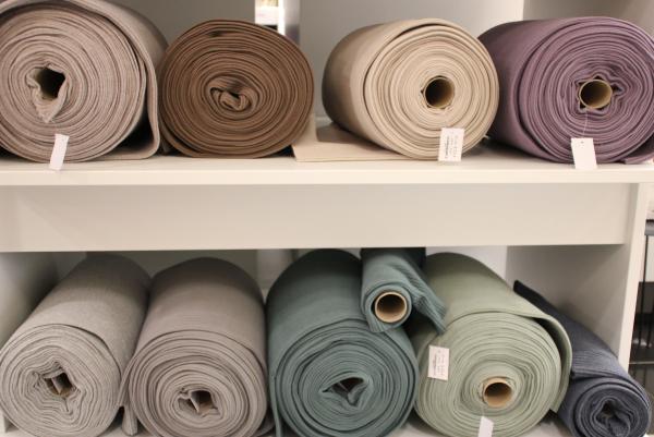 Wer selber stöbern möchte kann sich an den beschrifteten Regalen orientieren. Farblich sortierte Stoffballen helfen bei der visuellen Suche nach dem passenden Material.